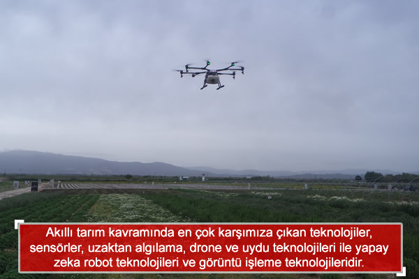Akıllı tarım kavramında en çok karşımıza çıkan teknolojiler sensörler, uzaktan algılama drone ve uydu teknolojileri, yapay zeka, robot teknolojileri ile görüntü işleme teknolojileri. Sensörlerle toprağın ve havanın ısısını ölçebilmek, sulama ve ilaçlama gibi işlerde daha bilinçli ve kararında uygulama yapmayı sağlıyor. Lokal meteoroloji istasyonları ile bölgesel tahminlere ulaşılabiliyor. Böylece çiftçiler kendi bölgelerindeki hava şartlarına daha hakim olarak karar alabiliyorlar. Akıllı sulama sistemleri de yine hayatı kolaylaştıran ve su tasarrufu sağlayan teknolojilerden biri. Artık cep telefonundan bile kontrol edilebilen sistemler mevcut. Tarlaya gitme zahmetine ve masrafına katlanmadan çiftçiler bulundukları yerden tarlalarını sulama şansına sahipler. Uydu görüntü işleme sistemleri ile arazilerin verimliliğini ve bu verimliliği etkileyen faktörleri hiç araziye gitmeden tespit edebilmemiz mümkün oluyor. Görüntü işleme teknolojileri ile hastalık ve zararlıları çok kolayca tespit edebiliyoruz.